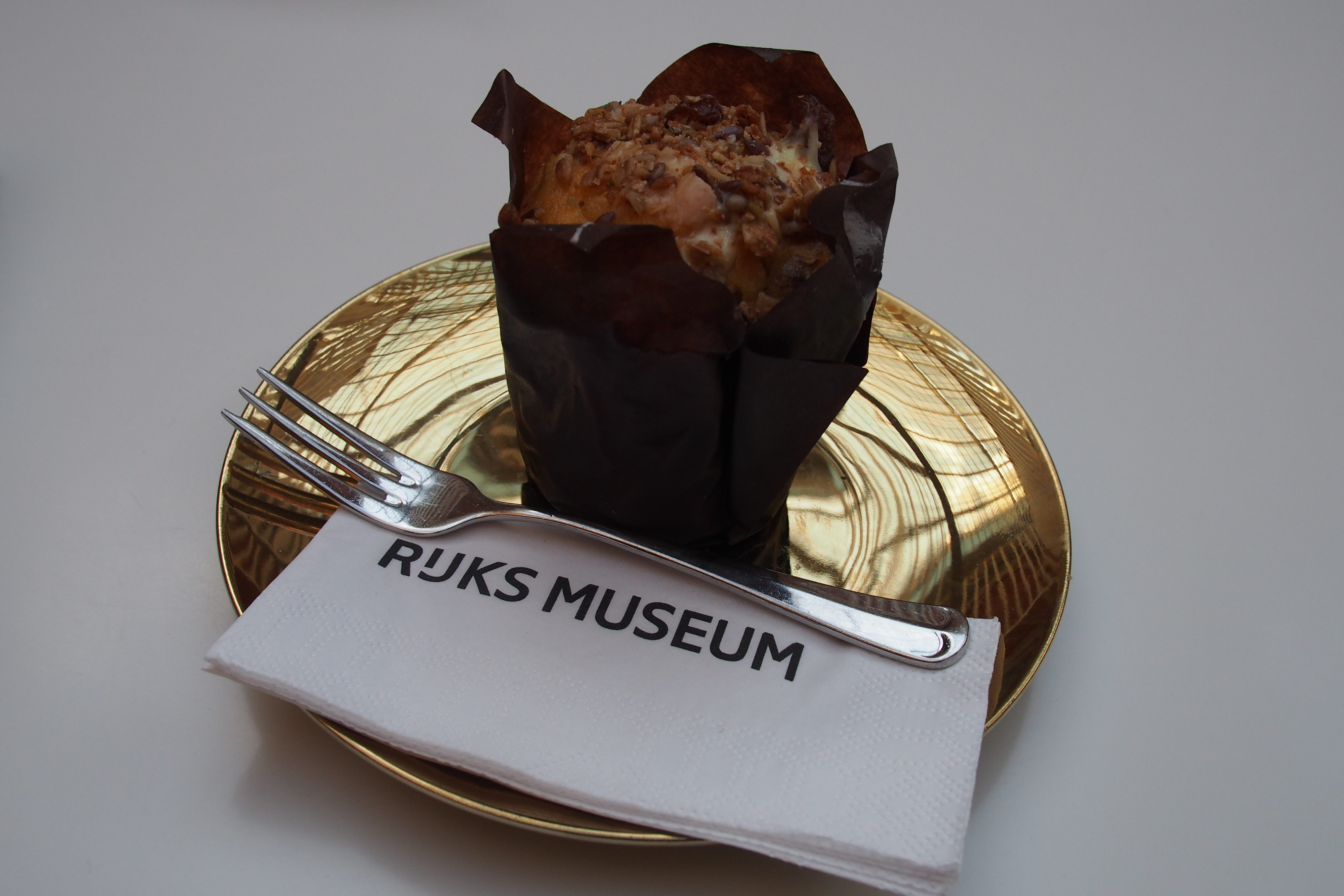 Then the muffin arrived. I fell silent for a moment and decided to take a picture there and then. Sure I made the obligatory round to photograph the “Nachtwacht” but then I am presented with a muffin on a shiny gold coloured saucer.