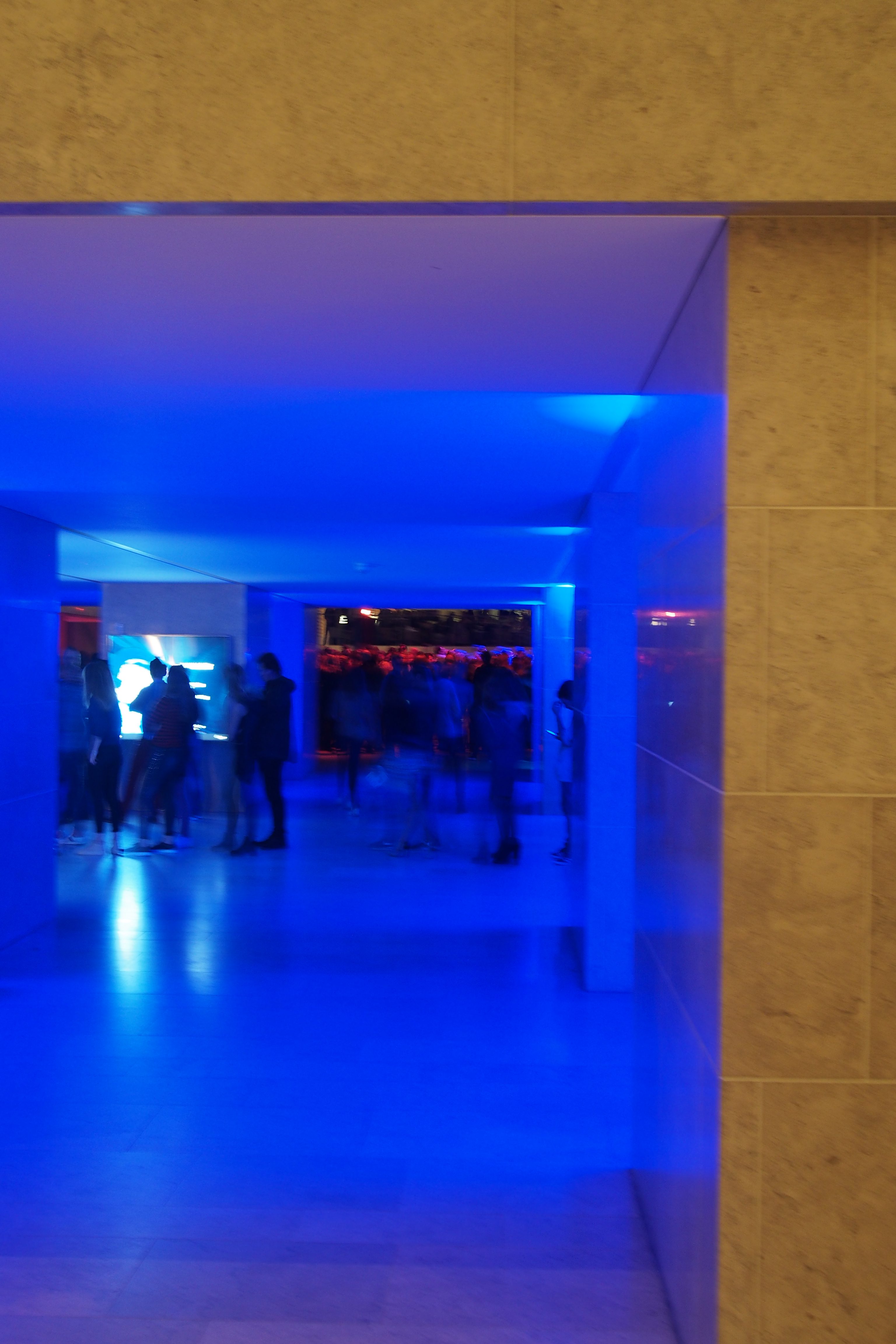 Blue lights led to a busy dance hall…