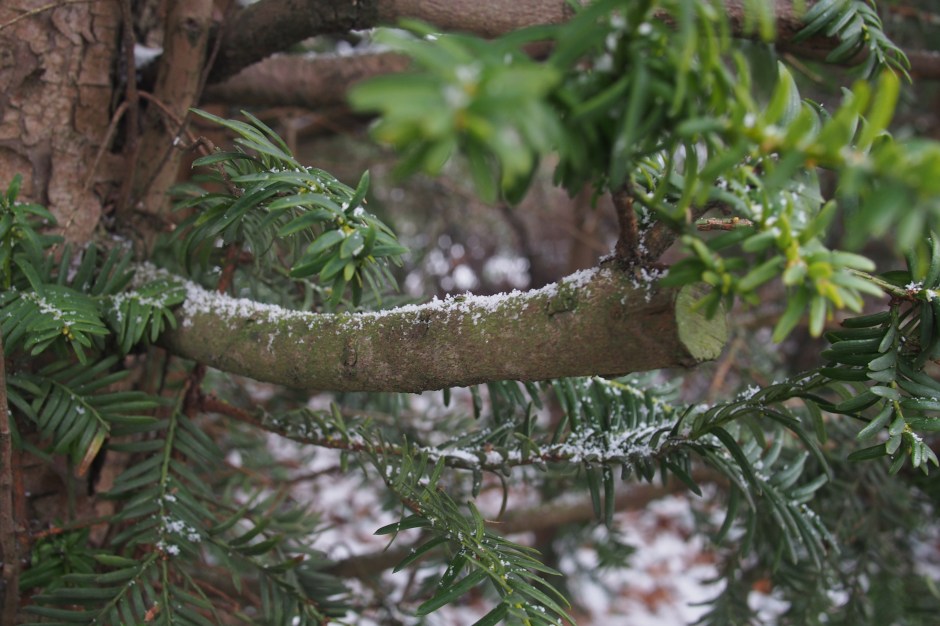 A twig with snow flakes.