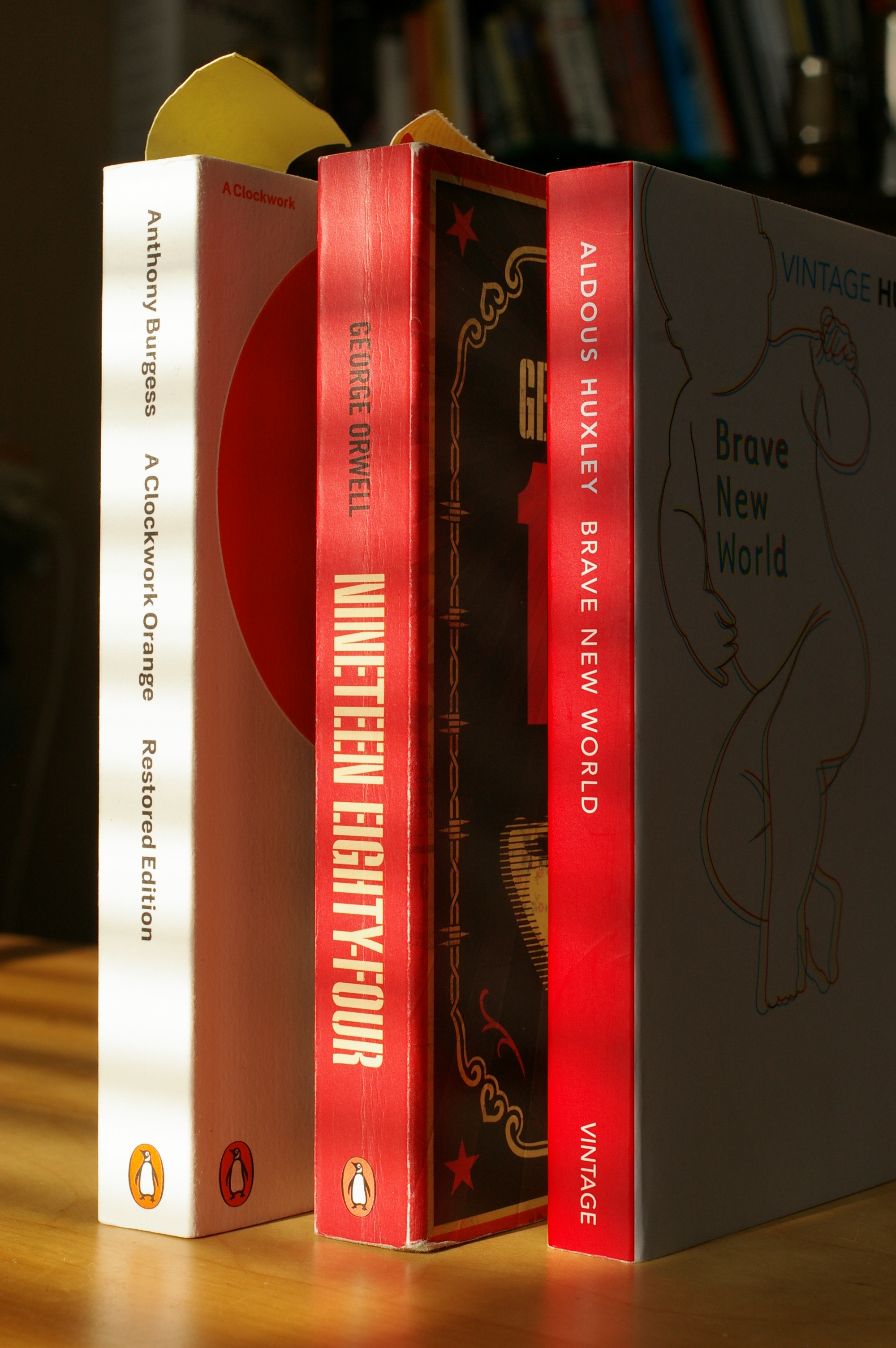 One thing I have not mentioned yet is something peculiar. I each novel love and relationships play a subtle and important role by their absence. In “A Brave New World” love does not exist. Relationships are loose, purely sexual and monogamy is unacceptable. In “1984” marriage exists but is without affection or passion. Real affection and passion are an undermining factor for society. In “A Clockwork Orange” Alex thinks of love and relationships as “the old in and out.” Life is an obligatory routine without excitement and therefore he turns to criminal and violent existence. Even his parents cannot reach Alex. Only when he makes up his mind after years of criminality, treatment and seeing his old friends again he chooses to change.